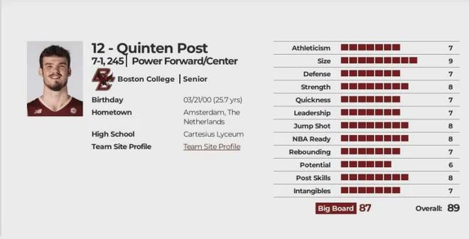 接着我们看他在2024年6月27日的最后一份选秀报告,选秀综合评分89分,选秀模版(梅米特-奥库,就是那个让姚明吃尽苦头的前爵士中锋)Potential潜力评分极低,Athleticism力量、Defense防守、Quickness速度、Leadership领导力、Rebounding篮板、Intangibles无形资产方面评价都不高,预计选秀顺位落选,实际次轮第22顺位,可以看出他的选秀声望相比小杨差了一截.